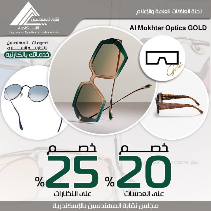 خصم مقدم من مركز المختار للبصريات بنسبة 25% على النظارات و20% على العدسات للسادة المهندسين وذويهم بموجب كارنيه النقابة الساري.العنوان: 63 شارع صفية زغلول بجوار ماكدونالدز– محطة الرمل.التليفون: 01007776940 – 01092621196