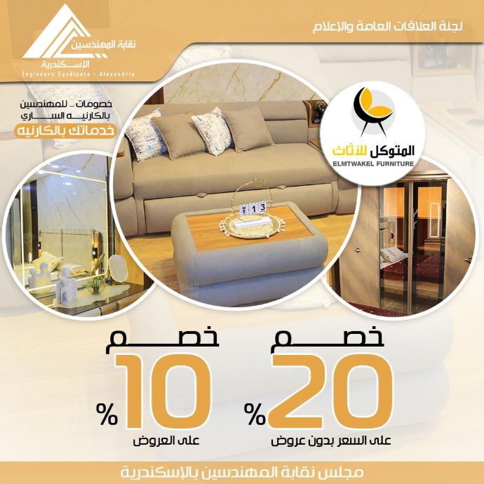 خصم 20% مقدم من على السعر خارج العروض و 10% على السعر أثناء العروض للسادة المهندسين بموجب كارنيه النقابة الساري و لذوي المهندس بكارنيه النادي الساري.