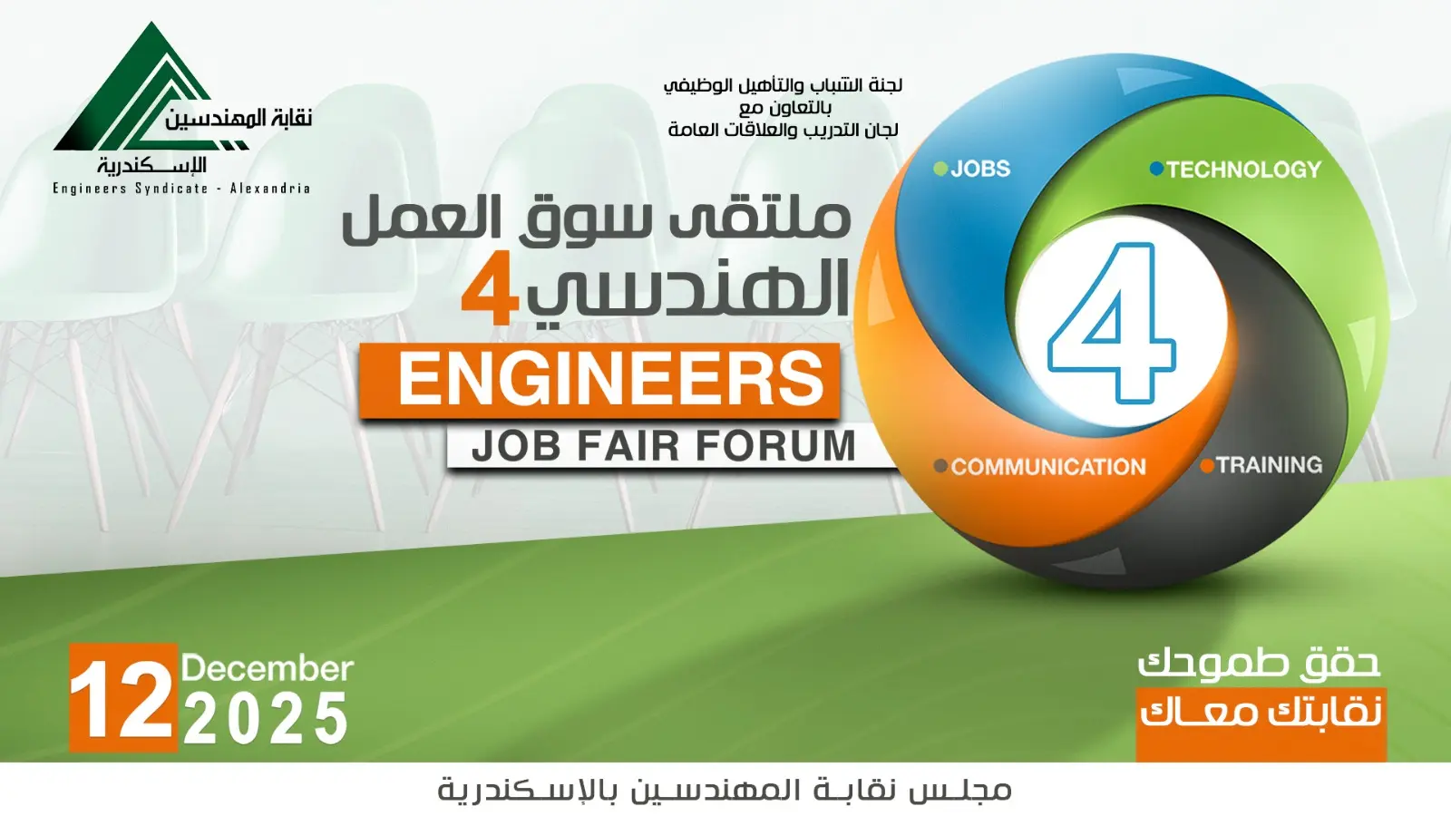 تنظم نقابة المهندسين بالإسكندرية ملتقى سوق العمل الهندسي 4 وذلك للعام الرابع على التوالي بنادي المهندسين وذلك يوم الجمعة الموافق 12 ديسمبر 2025